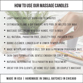 HOW IT WORKS: Light candle and let burn for 15-20 minutes. Extinguish flame and dip fingers into the pool of warm melted soy wax and along the edges. Massage into hands, feet, and other dry skin areas on the body for a deep hydrating, skin softening treatment. Natural alternative to a paraffin wax treatment. Great for spa clients, at-home self-care, or couple's massage.