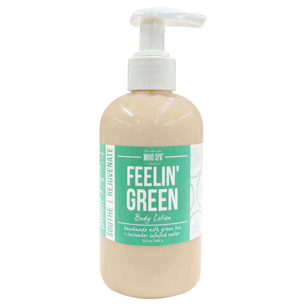 Feelin Green Body Lotion (8.5 oz) - formulated with an infusion of cucumber, basil and green tea leaves. A lightweight and silky lotion when applied absorbs quickly into the skin to hydrate without leaving a sticky residue. Grapeseed oil and olive oil leave skin glowing for long lasting moisture.