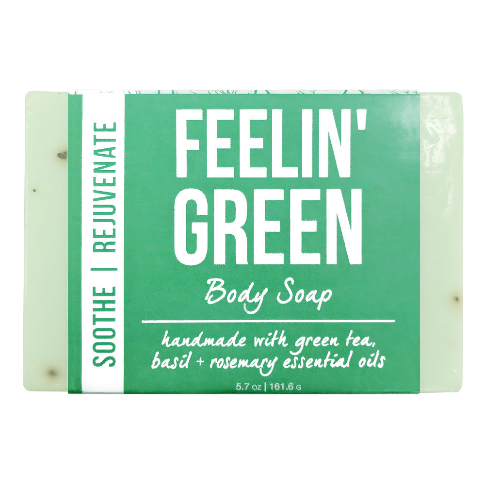 Feelin Green Body Soap (5.8 oz) - a glycerin based body soap formulated with castor oil and olive oil for a rich and creamy lather leaving the skin hydrated. Peppered with green tea leaves to gently exfoliate, and scented with the refreshing smells of cucumber and mint.