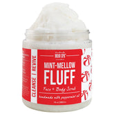 Mint Mellow Fluff Face & Body Scrub (9 oz) - a 3-in-1 scrub, cleanser and cream this sugar-based exfoliant is formulated with whipped coconut oil, cocoa butter and powered soap to cleanse and moisturize the skin during exfoliation. Peppermint essential oil improves skin tone and texture, while uplifting your mood. Gentle enough for sensitive skin.